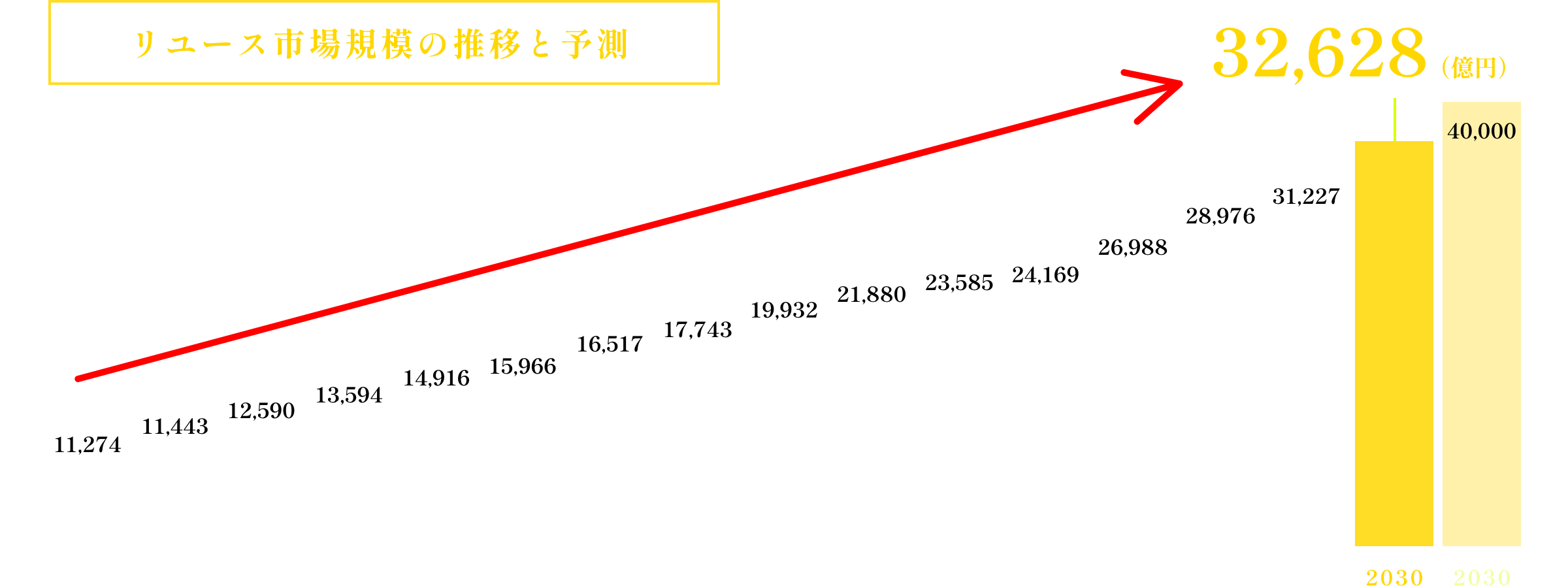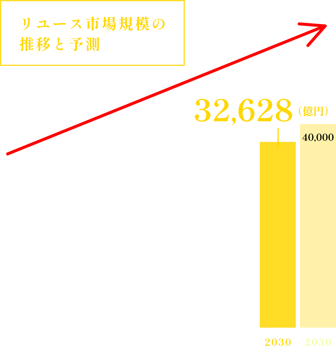 日本の総人口が2008年をピークに人口減に転じても、まだまだリユース業界は追い風の状態。2030年には4兆円規模に成長すると予測されています。安定して伸び続ける、希少な業界です。